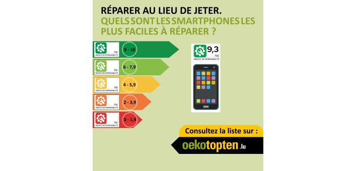 Das Oekotopten-Team hat auf der Grundlage des französischen Index eine Liste der am leichtesten zu reparierenden Smartphones, die in Luxemburg auf dem Markt sind, und einen Einkaufsratgeber erstellt. Die Liste kann auf der Oekotopten-Website eingesehen werden und wird regelmäßig aktualisiert. Das Fairphone 4 steht derzeit an der Spitze dieser Liste, was nicht verwunderlich ist, da der Hersteller dieses Modells die Reparierbarkeit zur obersten Priorität erklärt hat.