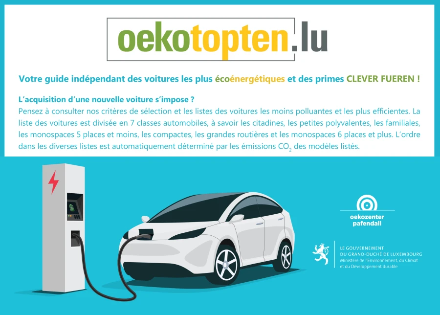 Aktualisierung der Liste mit den energieeffizientesten Elektroautos auf Oekotopten.lu Pünktlich zum Autofestival hat Oekotopten.lu seine Liste mit den energieeffizientesten Autos aktualisiert. Sie enthält nun ausschließlich vollelektrische Elektroautos (BEV) und damit nur noch emissionsfreie Antriebe (falls die Fahrzeuge mit Strom aus erneuerbaren Energien geladen werden).Read More