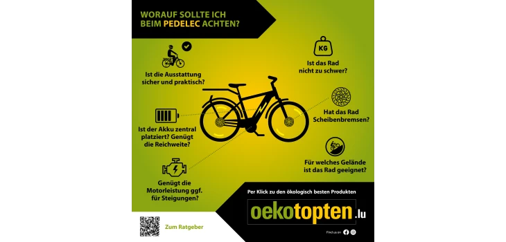 Oekotopten.lu hat drei Graphiken erstellt, die auf informative Weise auf die wichtigsten Fragen hinzeigen, die sich beim Kauf eines Pedelecs, e-Lastenrad und e-Faltrad stellen.